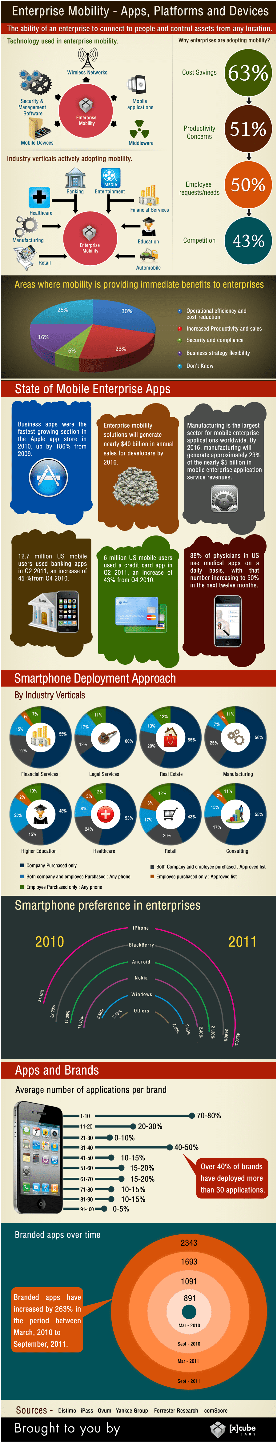 The enterprises are witnessing a transformation led by smartphones and Tablets. Mobility is slowly becoming a critical part of IT strategy. Here is an  informative infographic detailing out the technology used in enterprise mobility, industry verticals that are at the forefront of mobilizing its operations and why enterprises are adopting mobility solutions.