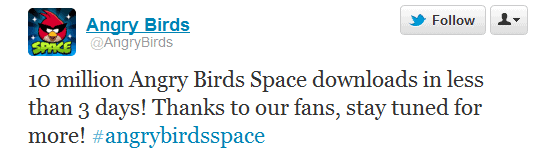 Angry Birds Space, a new game from Rovio release on march 22. Angry Birds Space was available for iPhone, iPad, Android, Mac and Windows. Today the company that created Angry Birds Space revealed in twitter that they got more than 10 million downloads in 3 days. FYI the new hunting is really addictive and fun.