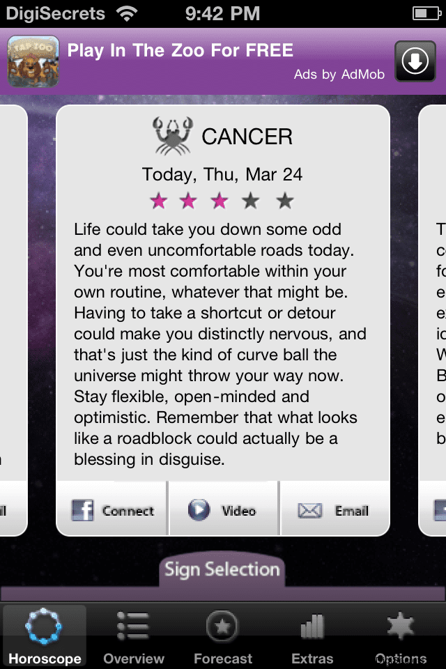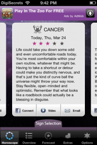 If you are a proud owner of iOS device or any android device you can check your horoscope on the go. Astrology & Horoscope by Kelli Fox makes this simple. In this app you can easily check the horoscope for your Sun sign for current, previous and the upcoming day. You can also check the simple forecast for a week.