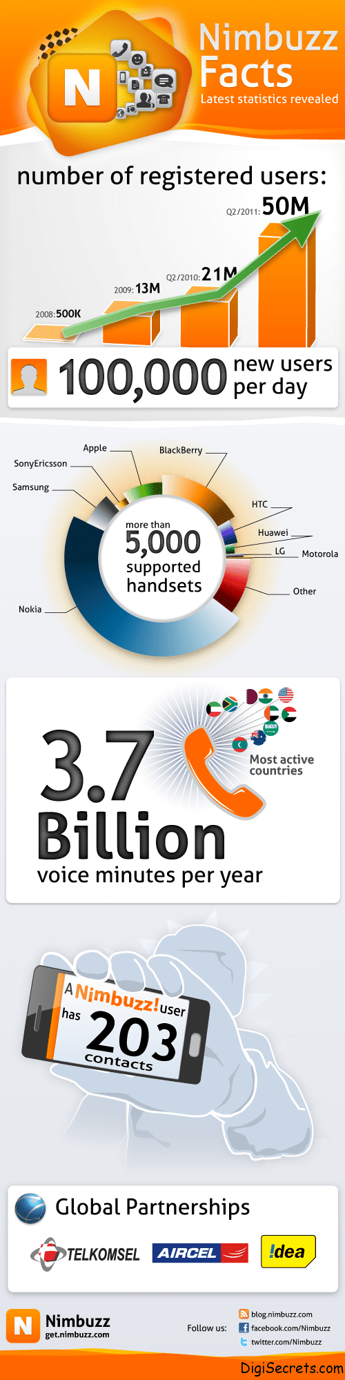 Nimbuzz is a free messaging service combining instant messaging, presence and VoIP. It integrates with most of the IM and chat services. Nimbuzz today officially announced that they are having 50 Million registeres users around the globe. Nimbuzz is available for both PC and mobile platform. Here is an awesome infographic released by Nimbuzz team. Some facts on Nimbuzz