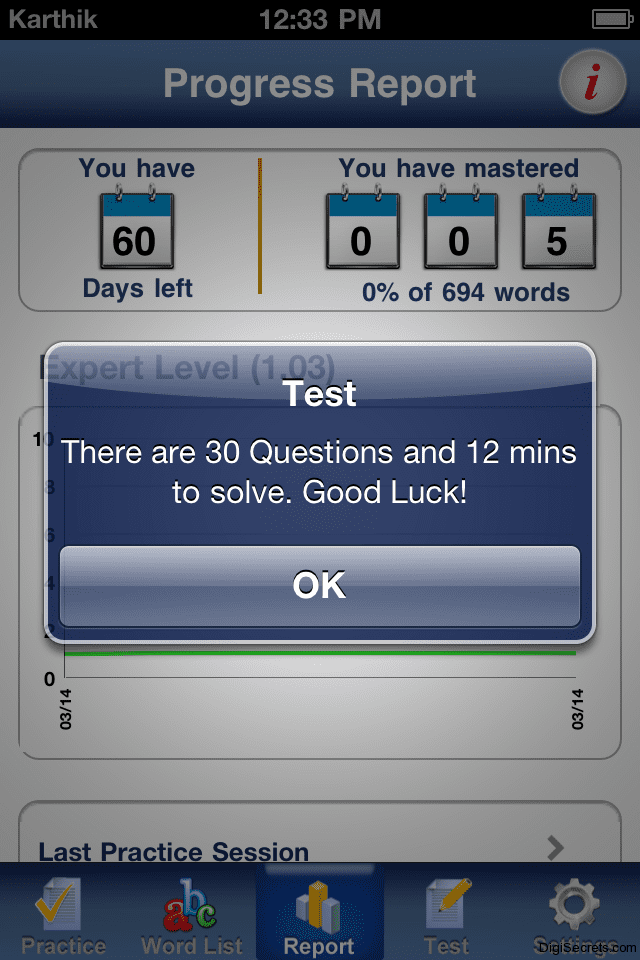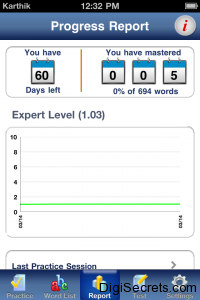 You will be asked 30 Question and you have 13 minutes to solve the answers. All the scores are added to the progress report and the statistics also shown about the performance. In Settings you can also select which level of words are to be asked to you.