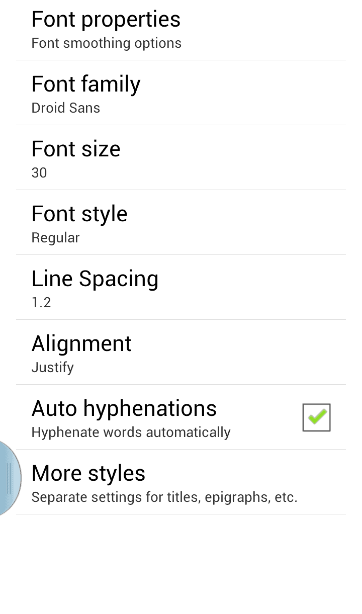There are various options to change font size, font smoothing options, font family change, auto hyphenations and background style change. Even you can include custom wallpaper as background or simply choose a custom colour as background.