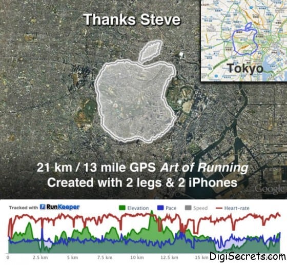 Runner Joseph Tame ran a half marathon in the shape of Apple logo. Every one knows Steve Jobs resigned as CEO of Apple. Joseph Tame showed his appreciation in a more visual way, using two iPhones (plus his legs) to map the equivalent of a digital heart for Steve Jobs. Tame, a marathon runner from Tokyo, ran 13 miles in 2 hours, with a specific route in mind: the Apple logo.