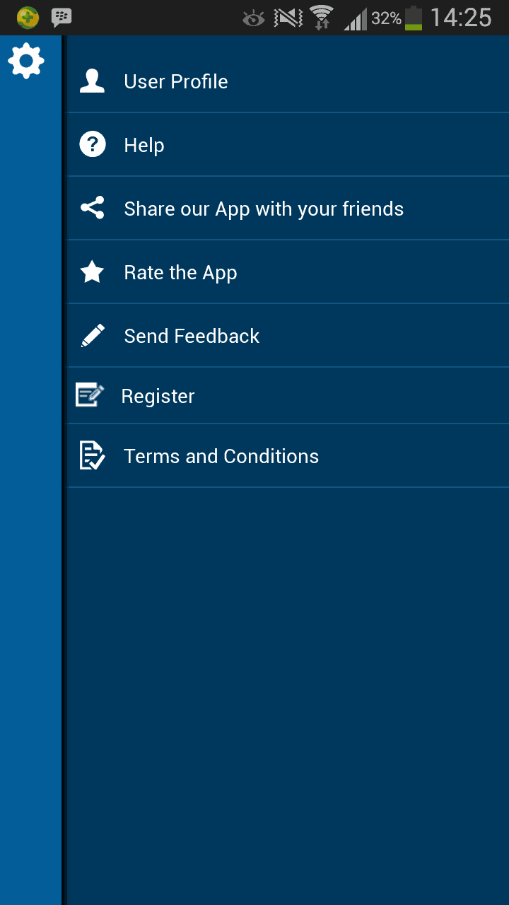 On the top right corner of screen is “Settings” button which navigates us to a panel as shown below. Here we can share the app with our friends, Create/Edit profile, Access help topics, Rate and send feedback for the app.