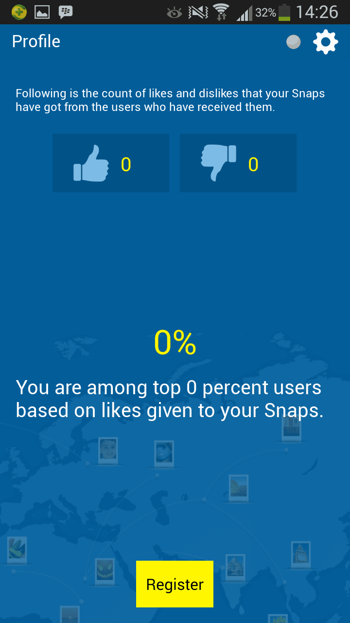 Clicking on User Profile re-directs us to page where we can see the number of likes/dislikes we have received totally for all our pics. There is a register button at the bottom where we can register to Snap Swap. It also shows us the top user percentage and where we stand amongst the other snap swap users based on likes we have received for our pics.