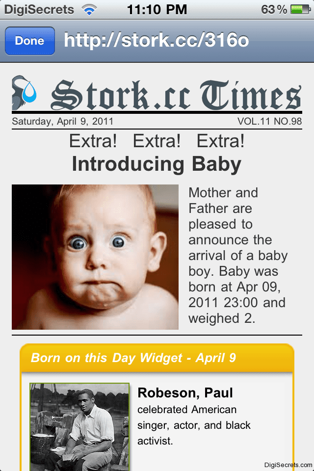Stork.cc is an app for parents to send their child birth announcements to their friends and family. When a new baby is born you will share the happiness with your friends and family. Stork.cc makes this simple. You have a pre-designed form to enter the details about the baby. This form contains the fields like Mother, father and baby name, height and weight, gender, date and time of birth.