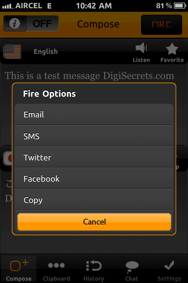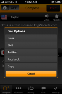 The most advantage of this app is you can directly post the translated texts via Facebook, Twitter ,Send via email or even send SMS.