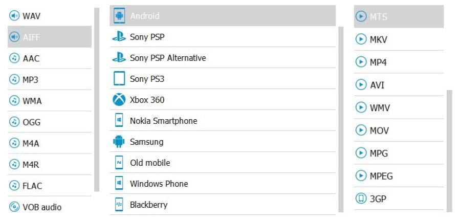 Above you can catch a glimpse of the plethora of choices available at your disposal for converting between different file formats. These choices are showcasing the vast number of combinations possible for your final output file. From left to right, you can see the different options for audio files; the list of formats that are device specific (there’s also Apple!) and at the end is the long list of video file formats that should be more than enough for supporting almost devices of all builds!