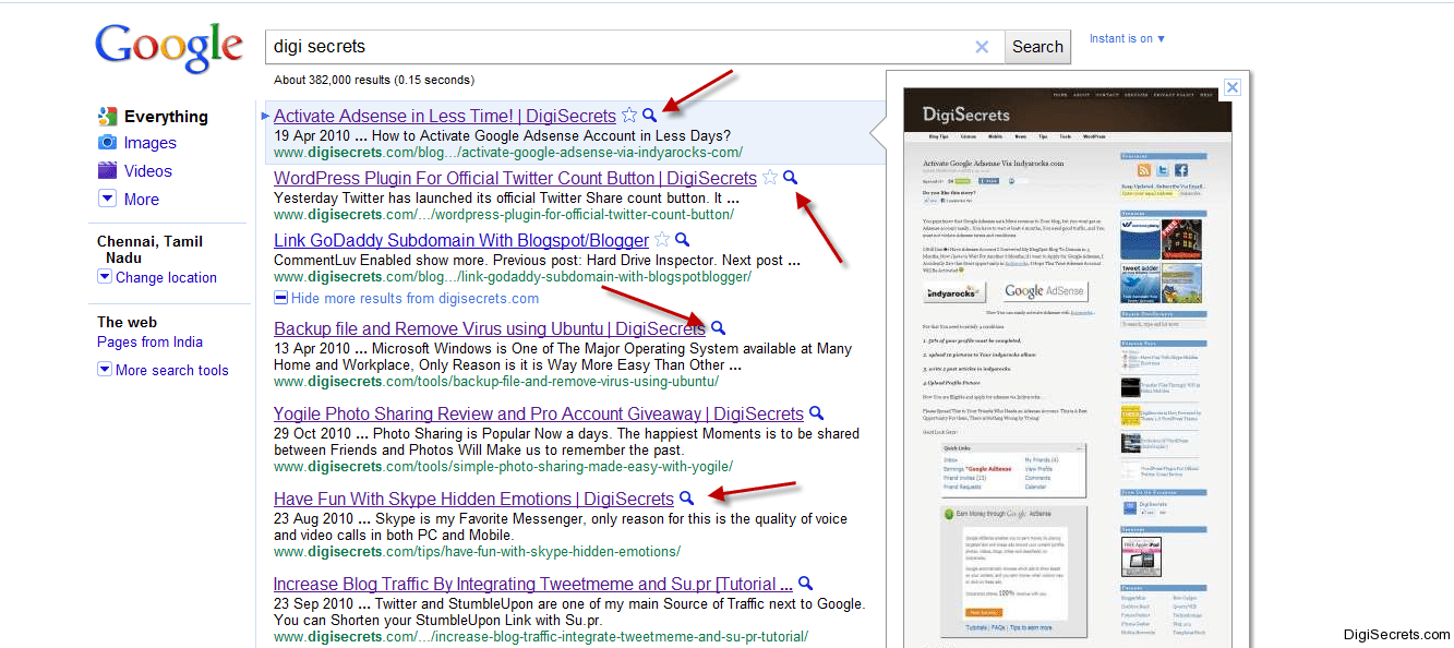 Google recently launched Instant Search Feature, now they have added the instant preview to the search results. when you hover over the search result the thumbnail of the website is shown. Now this makes the webmaster to concentrate more on the design 🙂