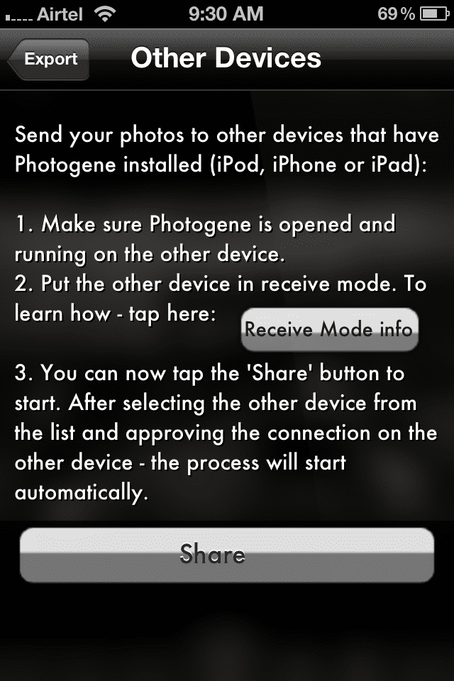Device-to-device: transfer photos directly to another iPad/iPhone (requires Photogene to be installed on the other device).