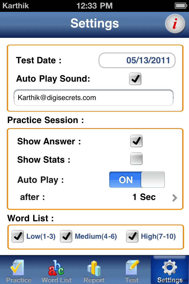 You will be asked 30 Question and you have 13 minutes to solve the answers. All the scores are added to the progress report and the statistics also shown about the performance. In Settings you can also select which level of words are to be asked to you.
