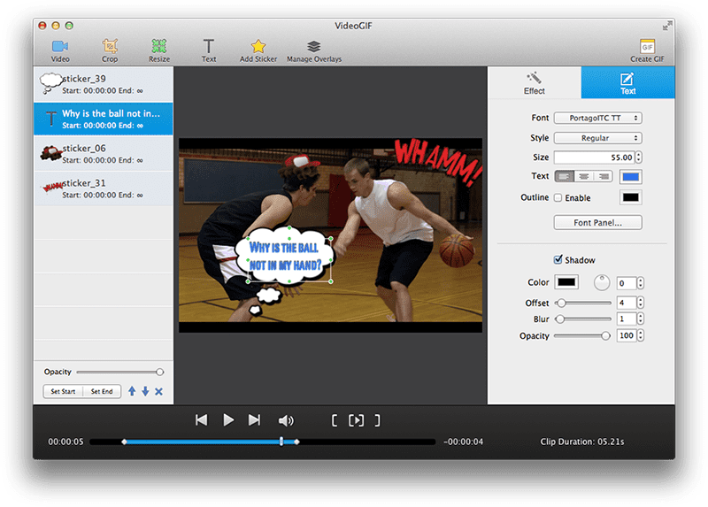 With the good performance and high quality, you are free to trim any clip from a video you like. VideoGIF makes it possible for you to add text and stickers to the GIF. You can adjust the start frame and end frame of overlays (text and stickers) freely. Moreover, you have the option to adjust each layer’s opacity and move any layer up or down freely.